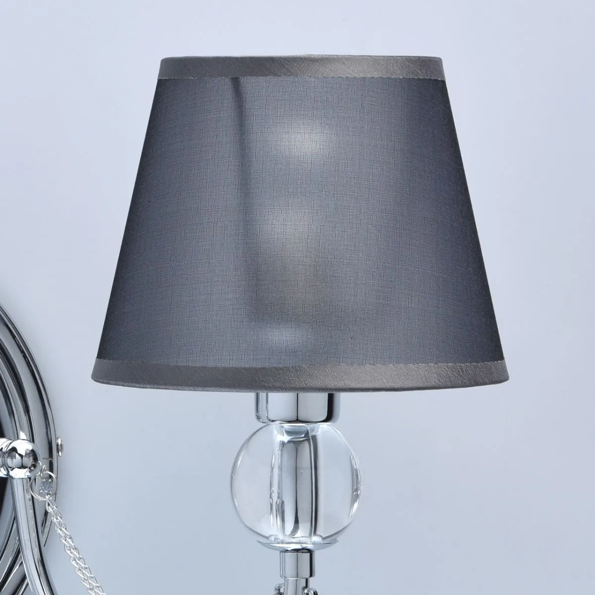 Основание/металл/ хром. Абажур/текстиль/дымчатый. Декор/акрил, хрусталь/прозрачный.