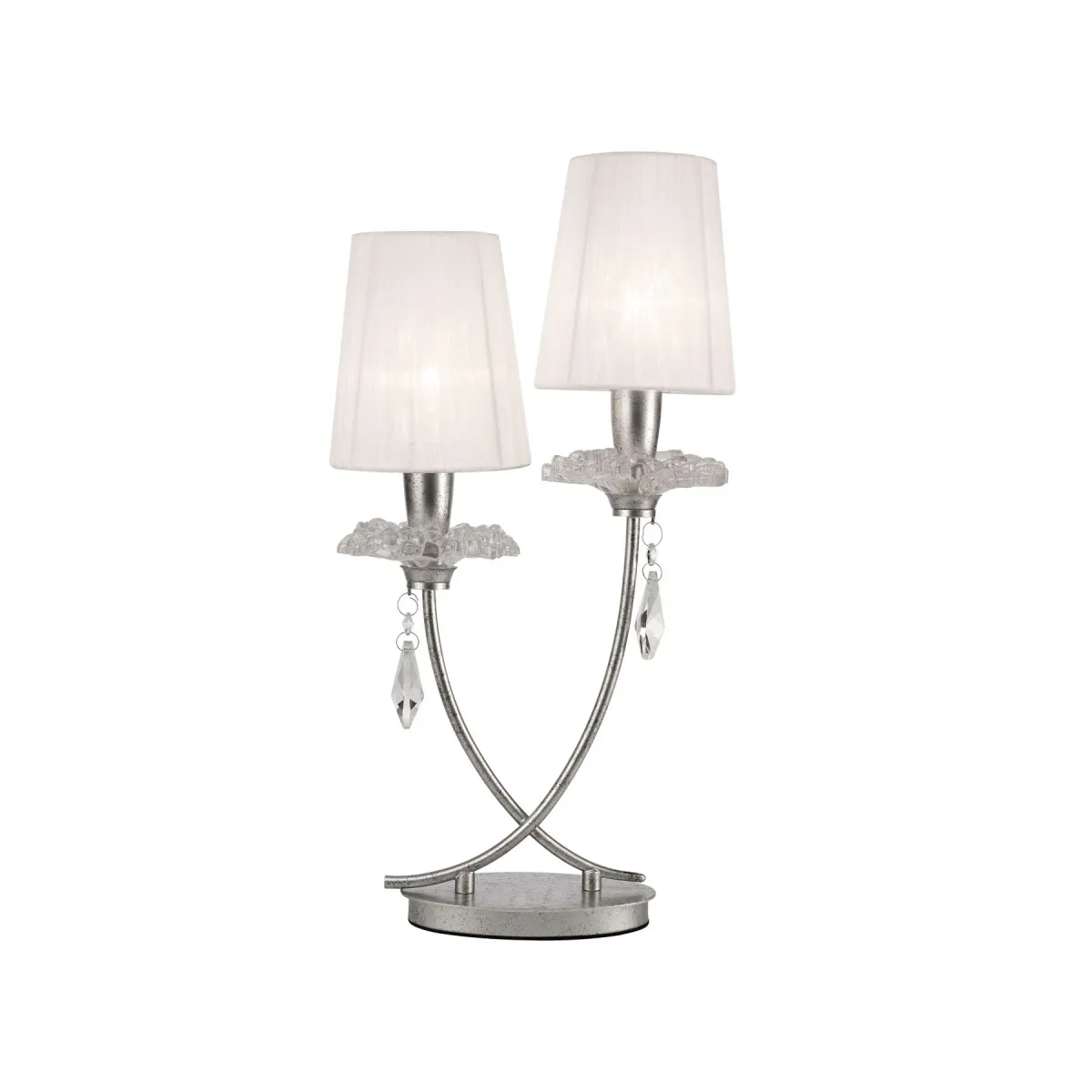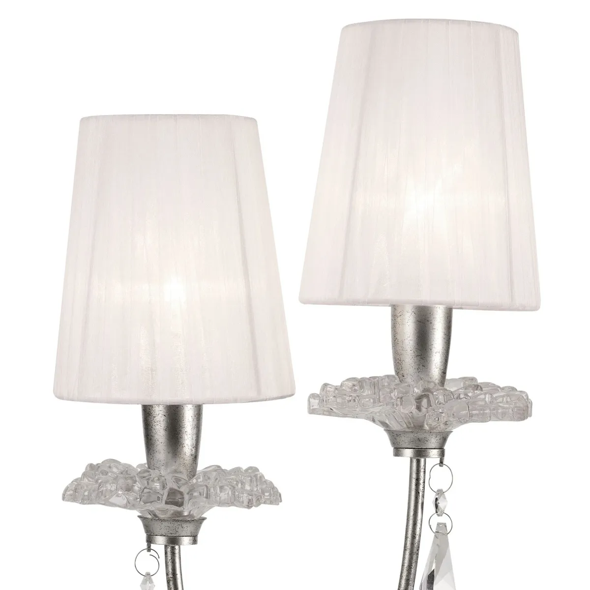 замысловатого кристаллизованного стекла и хрустальных капель, янтарных оттенков на золотых рамах и прозрачных на серебре. Небольшие интегрированные текстильные элементы разработаны так, чтобы наилучшим образом соответствовать цветовой отделке светильников. Современные оттенки белой органзы включены в каждый серебристый светильник, в то время как золотая отделка сочетается с более традиционным плиссированным кремовым шелком. Свет от ламп E14 фильтруется через абажуры спокойным и изящным способом, потрясающе преломляясь в хрустальных каплях. Дизайн